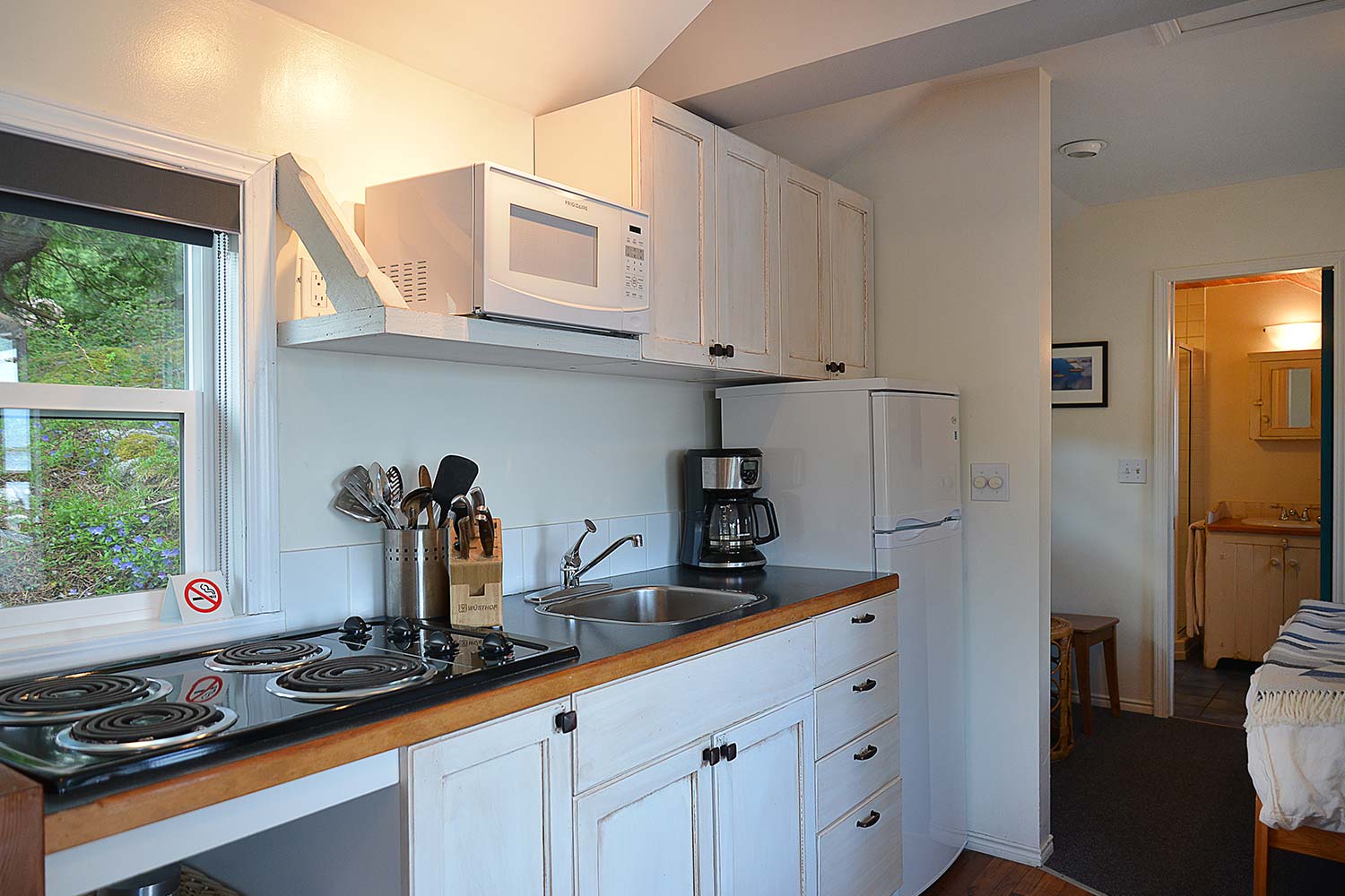 Nestled at the end of our property, the cottage is filled with natural light that streams through its scenic windows providing an expansive view toward the entrance to Pender Harbour and awesome sunsets. Fully enjoy the deck, relaxing in the Adirondack chairs provided. It’s an incredible location from which to view all that happens in an oceanfront location. Most days end with stunning sunsets.
